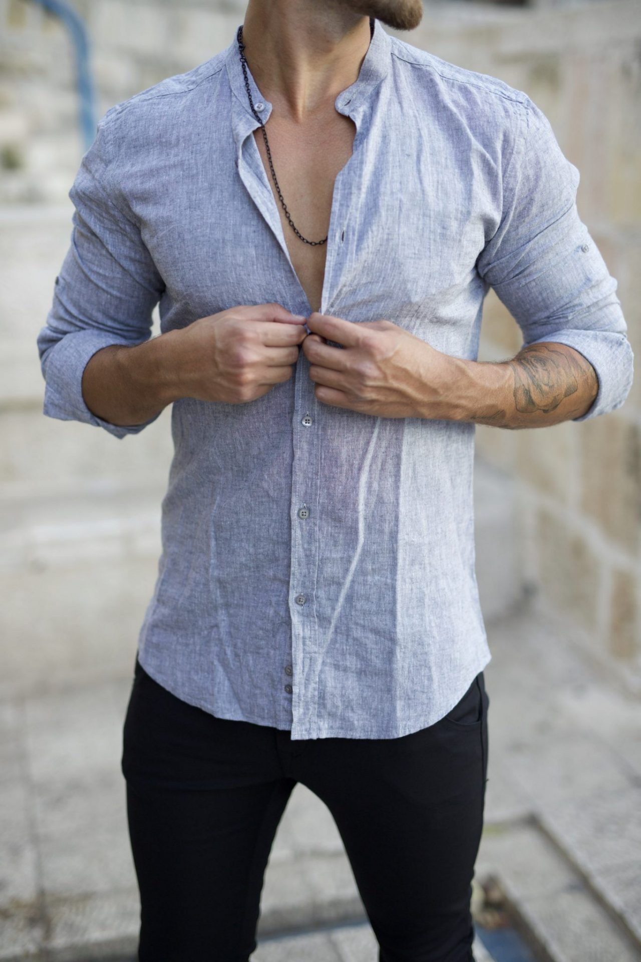 מכופתרת סלים פיט צאוורון סיני מבד פישתן בצבע תכלת