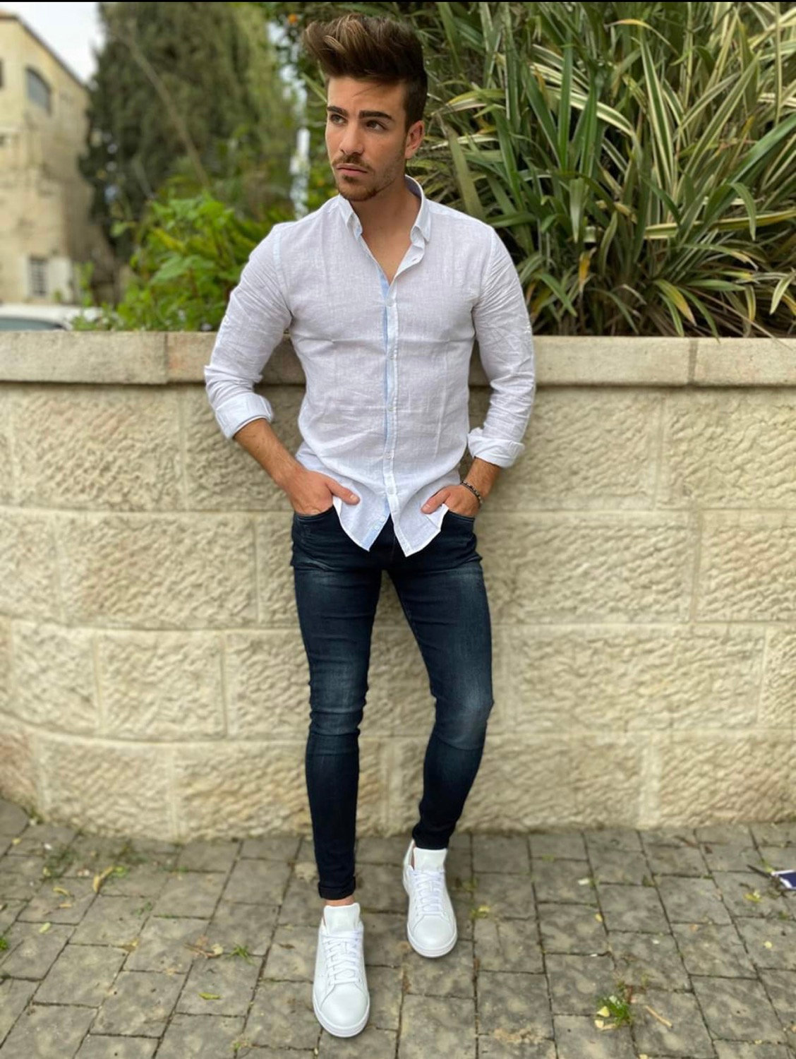 מכופתרת סלים פיט צאוורון סיני בצבע לבן