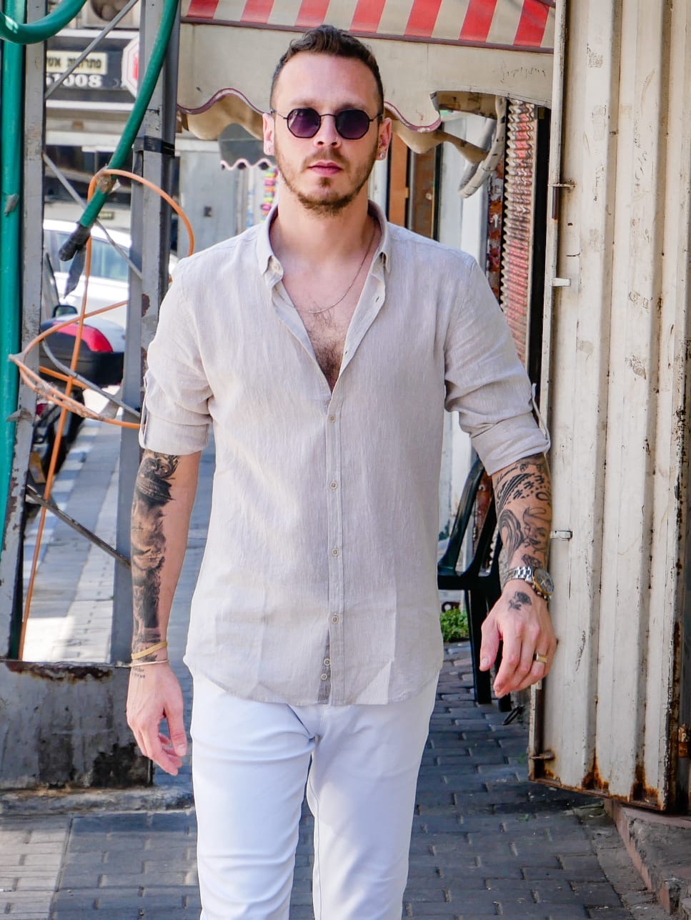 מכופתרת סלים פיט צאוורון קלאסי מבד פישתן בצבע בז'