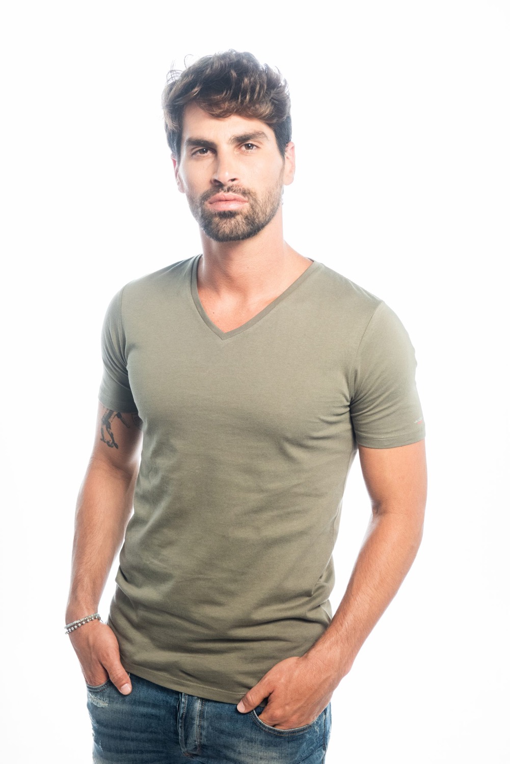 טישירט בייסיק מאה אחוז כותנה בצבע חאקי צווארון וי. מפרגנת ביותר עם שייפ מחמיא במיוחד שתתאים לך בול לדרינק עם חברים בבר השכונתי, לאיזה קוויקי בים ואחרי זה מתחת למכופתרת של החליפת חתן.