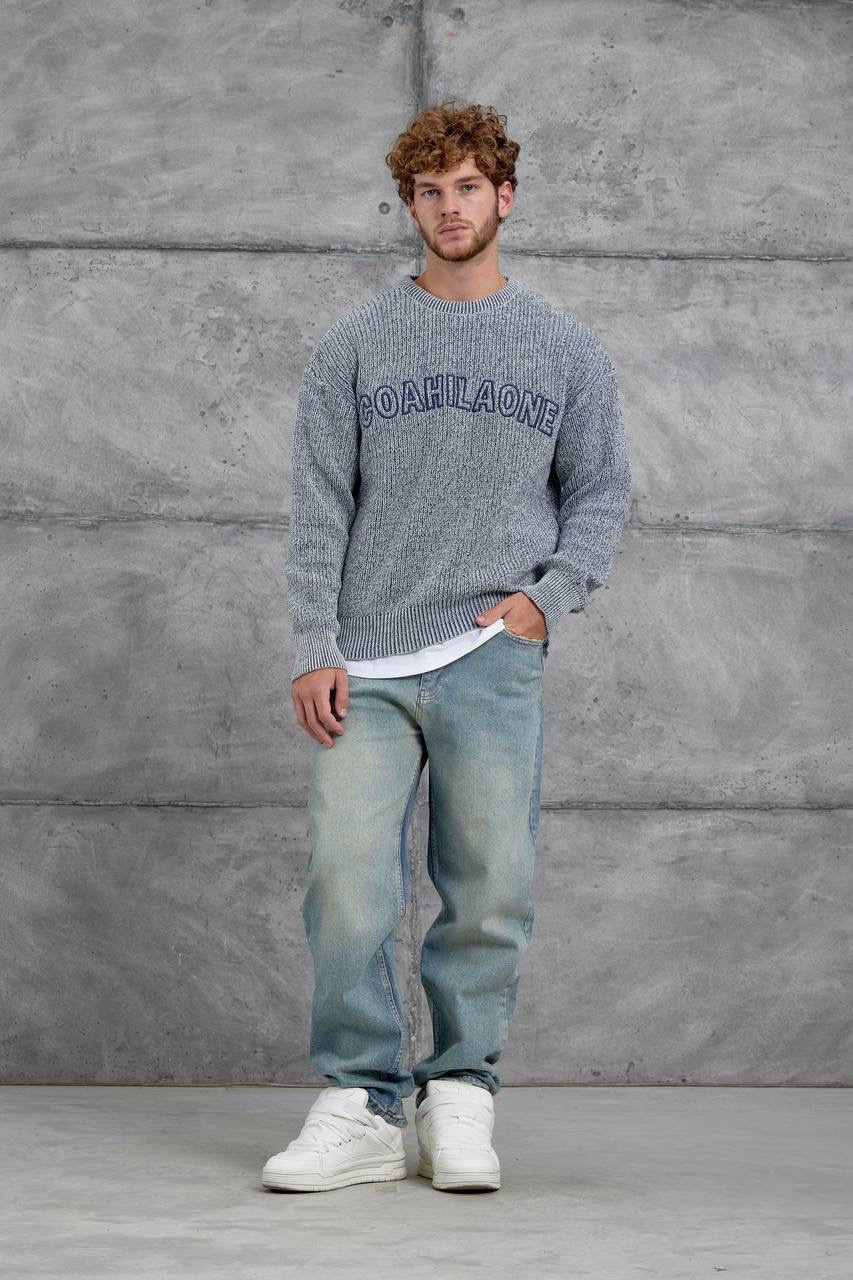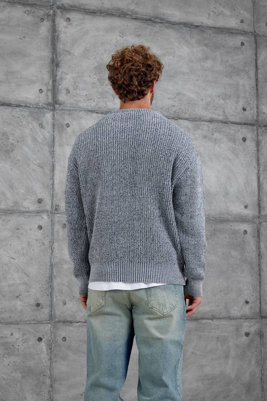 חולצת סוודר סריג לגבר בצבע כחול ג׳ינס עם רקמת לוגו